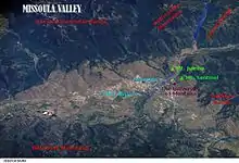Around 13,000 years ago, the entire valley was at the bottom of Glacial Lake Missoula. As could be expected for a former lake bottom, the layout of Missoula is relatively flat and surrounded by steep hills. Evidence of the city of Missoula's lake-bottom past can be seen in the form of ancient horizontal wave-cut shorelines on nearby Mount Sentinel and Mount Jumbo.[32] At the location of present-day University of Montana, the lake once had a depth of 950 feet (290 m).[33] The Clark Fork River enters the Missoula Valley from the east through Hellgate Canyon after joining the nearby Blackfoot River at the site of the former Milltown Dam. The Bitterroot River and multiple smaller tributaries join the Clark Fork on the western edge of Missoula. The city also sits at the convergence of five mountain ranges: the Bitterroot Mountains, Sapphire Range, Garnet Range, Rattlesnake Mountains, and the Reservation Divide, thus is often described as being the "hub of five valleys".[7]