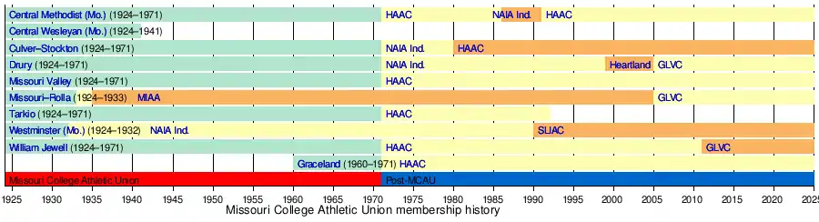 The Missouri College Athletic Union (MCAU) was an intercollegiate athletic conference that existed from 1924 to 1971. It consisted primarily of private universities from the state of Missouri that departed the Missouri Intercollegiate Athletic Association after its 1924 reorganization.[1] In 1970, the MCAU was reorganized as the Heart of America Athletic Conference (HAAC). However, the HAAC does not claim the Athletic Union's history.