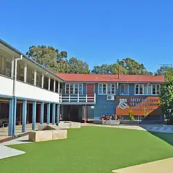 and connecting walkways between buildings. The buildings are set in landscaped grounds with mature trees, assembly and play areas, and sporting facilities. The school has a strong and ongoing association with the Mitchelton community.[1]