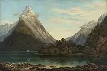 Mitre Peak is close to the shore of Milford Sound, in the Fiordland National Park in the southwestern South Island.[4] It rises to 5,560 feet (1,690 m) with almost sheer drops to the water. The peak is actually a closely grouped set of five peaks, although from most easily accessible viewpoints, it appears as a single point.[4] Milford Sound is part of Te Wahipounamu, a World Heritage Site as declared by UNESCO.[5] The imposing setting makes the peak a favourite object for painters.[6] A painting by Charles Decimus Barraud is held by the Sarjeant Gallery in Whanganui.[7]