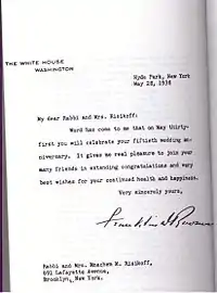 Risikoff's first name, "Mnachem," appears in variant forms including "Menachem" and "Menahem," but "Mnachem" is the spelling he seems to have preferred during his time in the United States, and was the spelling used in writings that spanned many years—from the 1938 letter from President Franklin Delano Roosevelt, congratulating Risikoff on his 50th wedding anniversary;[39] a news story in the Brooklyn Eagle about Risikoff that referred to him as "one of the oldest Orthodox rabbis in Brooklyn; a photo and caption on file with the Brooklyn Public Library;[40] and the 2010 press release from the Library of Congress that described the donation of two of Risikoff's unpublished manuscripts.[41] (In another Brooklyn Eagle article, Mnachem is used as the spelling of his first name, although his last name is spelled differently.) Most importantly, however, "Mnachem Risikoff" was the spelling Risikoff used on his own printed stationery.[42]