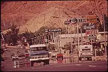 Prior to the construction of the railroad in 1883, Moab was a strategic place to cross the Colorado River. A toll ferry service across the river ended when a permanent bridge was built in 1911.[44] This bridge was replaced with a new bridge in 1955, which was in turn replaced by another new bridge in 2010. The 1955 bridge was subsequently demolished. The highway that uses this bridge has been renumbered multiple times and is now numbered U.S. Route 191.