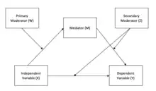 Moderated mediation relies on the same underlying models (specified above) as mediated moderation. The main difference between the two processes is whether there is overall moderation of the treatment effect of A on the outcome variable C. If there is, then there is mediated moderation. If there is no overall moderation of A on C, then there is moderated mediation.[1]