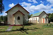 The Deloraine Wesleyan district decided, in 1875, to erect a chapel in Mole creek.[34] Construction began on the Methodist (Wesleyan) church, on donated land, and an associated cottage in late 1876.[35] It was completed in 1878, then enlarged in 1880, at which time the original building was moved to the rear and used as a supper room. An adjacent church hall was added in 1919.[36] The Wesleyan chapel was rented by the Government for a school from at least June 1879.[37] A new parsonage was built and opened in 1956 but was subsequently sold to Forestry Tasmania in 1972. In 1976, along with most Methodist churches in Australia, it became part of the Uniting Church in Australia.[38] It was still used as of 1996[36] but was subsequently closed and sold.[note 2]