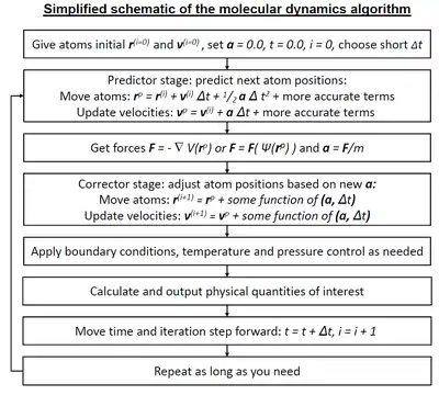 A simplified description of the standard molecular dynamics simulation algorithm, when a predictor-corrector-type integrator is used. The forces may come either from classical interatomic potentials (described mathematically as ) or quantum mechanical (described mathematically as ) methods. Large differences exist between different integrators; some do not have exactly the same highest-order terms as indicated in the flow chart, many also use higher-order time derivatives, and some use both the current and prior time step in variable-time step schemes.