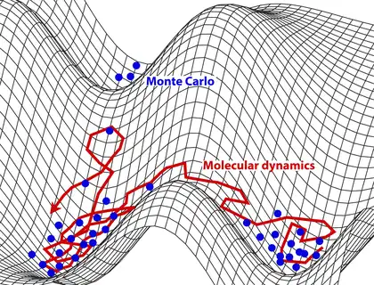 Schematic representation of the sampling of the system's potential energy surface with molecular dynamics (in red) compared to Monte Carlo methods (in blue).