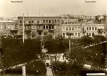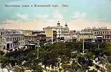 In the second half of the 19th century, when the oil and related industries began to develop intensively, the residential areas already accounted a significant percentage of the citywide development in the northeastern part of the Icheri Sheher fortress (the historical district of Baku). In the 1860s, the Molokan settlement arose in the suburb sphere of influence. In connection with the development of the central quarters, the Molokan Slobodka with its courtyards and stables was demolished to the ground, and the Molokans were relocated to a completely new area of Zavokzalye, where a new Molokan carriage settlement was created.[2] On the site of the settlement, the Mariinsky Square was laid out.[3] The square was created in the early 1870s in the immediate vicinity of the rich residential areas.[1] The square was located in one of the central districts of the city - Primorsky. The parks surrounding neighborhoods gave it a reserved character.