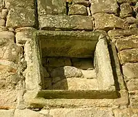 The ruins of Monkcastle are in woodland to the west of the A737 trunk road on the right bank of the River Garnock, 1+1⁄4 miles (2.0 km) south of Dalry and 2+1⁄2 miles (4.0 km) north of Kilwinning and represent a small, late 16th or early 17th century 'T-plan' laird's house which has replaced some of the earlier structures that stood on the site;[14] a Monkcastle is recorded in 1536.[15] The castle measures around 48 ft by 18 ft, standing two storeys high, with a central staircase tower projecting, and rising one storey higher.[12] The entirely ruinous interior has extensive brickwork and concrete supports; the ground floor is vaulted. The entrance door is unusually wide and low, with carvings above. The building is domestic, rather than military in style, with corbie-stepped gables and stones laid in courses.[16] In 1895 Smith records the castle ruins as having been recently restored, suggesting consolidation work.[17] Hooks for window shutters survive at the first floor level.[14] Crow stepped dormer heads were added in the 19th century and windows on the south elevation may have been enlarged at this time.[14] The buildings rear wall has been greatly altered to give access to another building circa 19th century.[14]