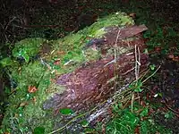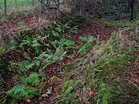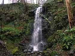 A rocky glen runs up from Monkcastle with a significant waterfall and a listing as part of a Scottish Wildlife Trust local site for nature conservation. The glen was partly formed from quarrying work for freestone.[35] A previous course of the Monkcastle Burn can still be followed and this probably resulted from the quarrying intruding into the original course of the burn at the head of the glen resulting in a waterfall and the burn then following the bed of the glen itself. The geology consists of Carboniferous limestone, macroporphyritic basalt, and an overlay of basalt and boulder clay. The quarry workers are thought to have made used of Old Monkcastle as office space for storage, etc. The OS maps show that quarrying had ceased by the start of the 20th century.[35]