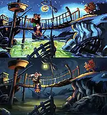 The game's artists and animators - as well as its composers - collaborated with LucasArts programmers to shape an engaging realization of the game's scenario, stylized to utilize cinematic techniques such as scrolling panoramas of the title's environments and proportional character scaling.[33] Less than a year after the launch of the game, Dave Grossman described aspects of its presentation with the term "interactive cartoon", in that the title was conducive to "crazy and cartoony" interactive sequences.[58] He cited the example of the game's sequence wherein Largo LaGrande extorted money and valuables from Guybrush Threepwood on the bridge leading to Woodtick, an event which Grossman said to prompt players "[to save] the game at that point so they could go back and watch it a few times".[58] Peter Chan said that the artistic direction of Monkey Island 2 was already decided when he joined its team, which focused his efforts on attempting to mimic existing visual references, although the corporate culture of LucasArts at the time allowed him opportunities to introduce unplanned graphical elements in the game.[62] In contrast, Ahern retrospectively voiced his discontent with the game's visual style, which he said was uneven because of the artists' capability to add stylistically disparate graphics assets to the title without immediate supervision.[62] He explained that "there was nobody officially art directing [the game] and coming in and saying, 'No, that character's off-model, or that needs to look more like this'".[62] Ahern was frustrated with this situation, which he believed to be the source of a major stylistic dissonance between the game's individual scenes.[62] As a result of this experience, when Ahern was appointed to serve as an animator for Day of the Tentacle,[62] he requested LucasArts for the authority to institute uniform design criteria for that title's art team, so as to facilitate a cohesive artistic process.[62] Conversely, Grossman later indicated that Monkey Island 2's artwork–along with its music–imparted "a terrific sense of place" and a "tremendously cinematic" ambiance to the game.[50]