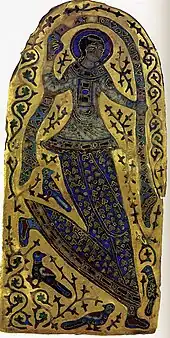 The two smaller plates depicting dancing women are identical rather than symmetrical. Their backgrounds are also decorated with foliage, but they lack identifying inscriptions. The dancers wave their veils over their heads and bend their right leg sharply backwards.[14] The idea that they are professional dancers may be contradicted by the haloes on their heads, which indicates that they belong to the sacred realm. However, sacred dancing is rare in Christianity, at least before the Renaissance, and the iconography is most unusual in a context to do with public imperial ceremony and coronation, where the Byzantines placed great stress on the emperor as God's agent on earth.[3]