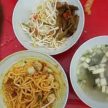 Khotaung mont di (ခိုတောင်မုန့်တီ) is a well-known Burmese noodle salad originating from the small village of Khotaung in Sagaing Region.[5] The salad uses thick rice noodles (also used in nan gyi thoke) and fish balls, mixed with chopped cabbage, green beans, pickled radish, chickpea flour, garlic oil, with optional toppings, including Burmese fritters, jengkol, and fish cake.[6][7] The dish is typically accompanied with a light broth made from fish balls and fish head.[7] The origins of the dish date to the Konbaung dynasty. One of Mindon Min's pregnant queens once had a craving for worms.[7] Khotaung villagers, in response, dressed thick rice noodles with garlic oil, which eventually became Khotaung mont di.[7]