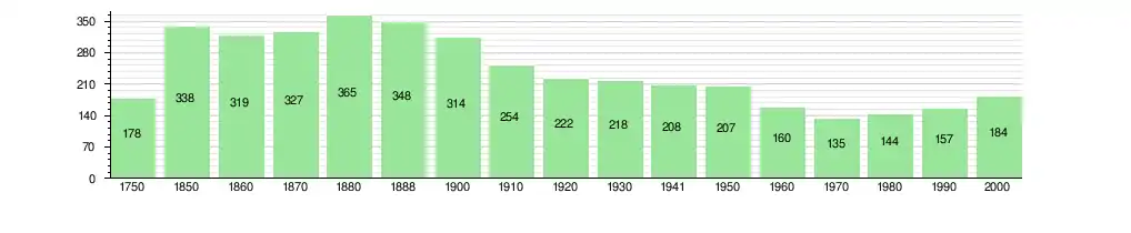Montalchez has a population (as of December 2020) of 240.[6] As of 2008, 4.4% of the population are resident foreign nationals.[7] Over the last 10 years (2000–2010 ) the population has changed at a rate of 37.6%. It has changed at a rate of 27.1% due to migration and at a rate of 10% due to births and deaths.[8]