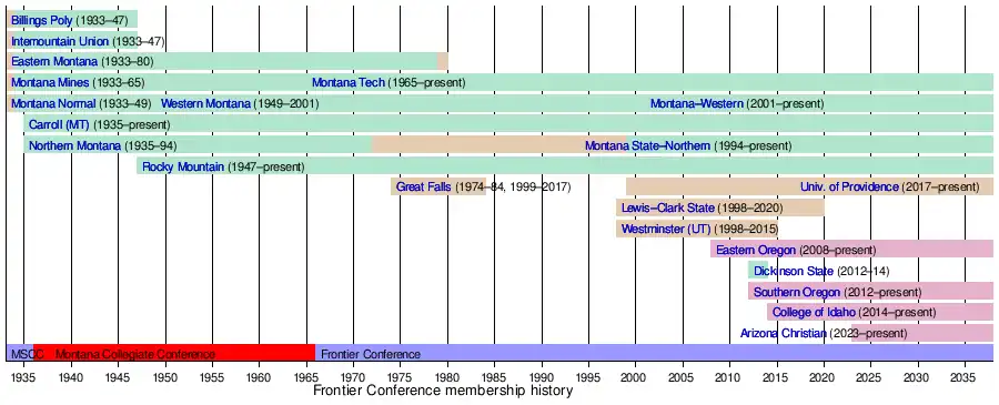 The Montana Small College Conference (MSCC) was established in 1934 by the five smaller schools (Montana Technological University, the University of Montana Western, Montana State University–Northern, Intermountain Union College and Billings Polytechnic Institute) in the state. The MSCC was renamed as the Montana Collegiate Conference (MCC) in 1936, with the additions of Montana State University Billings and Carroll College joining. The merger of International Union and Billings Poly to become Rocky Mountain College occurred in 1947. After nearly three decades, the conference reestablished itself under its current moniker in November 1966, containing the same six schools until 1974.[1] The University of Providence (then the College of Great Falls) joined that year, however would only stay for a decade. MSU Billings left for the first incarnation of the Great Northwest Athletic Conference in 1988, leaving the Frontier at five members for another decade. The conference opened up outside of Montana for the first time in 1998, with schools from Idaho (Lewis–Clark State College) and Utah (Westminster College) joining. Great Falls re-joined in 1999. Dickinson State University joined in 2012, only to leave in 2014 to join the North Star Athletic Association (NSAA). Westminster (Utah) left for the National Collegiate Athletic Association (NCAA) Division II ranks and re-joined the Rocky Mountain Athletic Conference (RMAC) in 2015. Lewis–Clark State left for the Cascade Collegiate Conference as a full member in 2020.[2]
