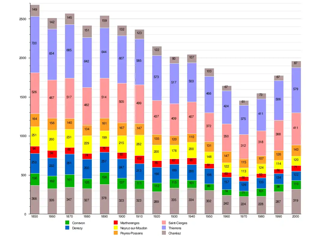 Chapelle-sur-Moudon is first mentioned in 1177 as Capellam. In 1228 it was mentioned as Capella Vualdana. Under Bernese administration, it was known as Chapelle Vaudanne. After the creation of the Canton of Vaud (1798) it was known as Chapelle (VD) until 1953.[4] Correvon is first mentioned in 1166 as Correuont.[5] Denezy is first mentioned in 929 as villare Donaciaco. In 1142 it was mentioned as Danisei.[6] Martherenges is first mentioned in the 15th Century as Martherenges.[7] Neyruz-sur-Moudon is first mentioned in 1147 as Noeruls and Nuruls. It was first called Neyruz-sur-Moudon in 1953.[8] Peyres is first mentioned in 1200 as Pairi. Possens was mentioned in 1230 as Pussens.[9] Saint-Cierges is first mentioned around 1145-54 as de sancto Sergio. In 1166 it was mentioned as de sancto Ciriaco.[10] Thierrens is first mentioned around 1004-07 as Teoderinco.[11] Chanéaz is first mentioned in 1184 as Chafneya.[12]