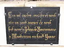 John the Fearless was killed on the town's bridge in September, 1419 by Tanneguy du Chastel and the sire de Barbazan, during a conference with the dauphin (who became in 1422 Charles VII). An inscription on the bridge recalls the event. In the collegiate church Notre-Dame-et-Saint-Loup there is a sword which has long been said to be John the Fearless', but actually this sword is certainly more recent.[3]