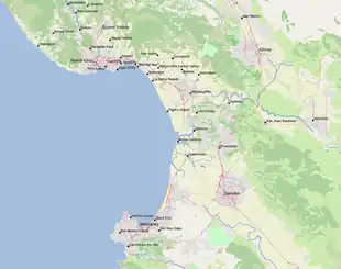 Monterey Bay is a bay of the Pacific Ocean located on the coast of the U.S. state of California, south of the San Francisco Bay Area. San Francisco itself is further north along the coast, by about 75 miles (120 km), accessible via Highway 1 and Highway 280.