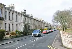 In the 1850s Baron Miller laid out Montgomerieston as a residential area. His feu plan, produced by Clarke and Bell[21] survives, however the square outline and circular central area layout was not followed.[31] Street names appropriate to the history of the barony and burgh have been applied,[2] such as Eglinton Terrace and Montgomerie Terrace for the first barons and later Cassillis Street and Ailsa Place for the Kennedy barons.[12][32] Cromwell himself is remembered at Cromwell Road.[32]