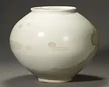 Moon jar is a type of traditional Korean white porcelain which was made during the Joseon dynasty (1392–1910).[1] The Joseon white porcelain was adopted as imperial ware in the fifteenth century. The name comes from its shape and milky color of the glaze to resemble the coloration of the moon