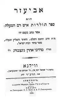 Among his other publications were Malakhut Filon ha-Yehudi (1836), an translation from German of Philo's embassy to Caligula, and the anthology Devir (1844), an eclectic collection of letters, tales, and sketches.[17] Many of Günzburg's works were published posthumously, most notably his autobiography Aviezer (1863, composed between 1828 and 1845),[18][12] as well as Ḥamat Dammeshek (1860), a history of the Damascus affair of 1840, and the satirical poem Tikkun Lavan ha-Arami (1864).[19][7]