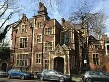 The house is built in the late 19th-century Tudorbethan style in red and blue interspersed brickwork, with various decorations including gables and statues of griffins and bears with shields. Tall groups of brick chimney stacks surmount the property. The stables of the house have a conical roof and are now garages. A swimming pool in a conservatory was added in the late 20th century. The Survey of London described the interior as having "...a predictable eclecticism of style, ranging from Jacobean in the long hallway containing an oak open-well staircase with twisted balusters and wide handrail to Adamesque in the double drawing-room at the front. The fittings include fine marble chimneypieces in a late-eighteenth-century manner. A room on the first floor may originally have been used as a chapel."[1] The London: North edition of the Pevsner Architectural Guides describes Mortimer House as "a picturesque composition", highlighting its "Tudor chimneys with crenelated pots and stone mullions".[8]