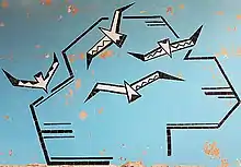 A mosaic is a panoramic, epic composition in spirit. Stark decoration is achieved due to the contrast of little pieces of shiny ceramic tiles, laid on the main compositional lines and contours, and matte colored cement background.[7]