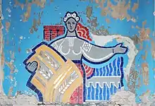 The girl in a national costume stands with a sheaf of wheat near the river dam, personifies the country's "breadbasket" image. According to researchers, the panel has a very stereotypical appearance.[7]