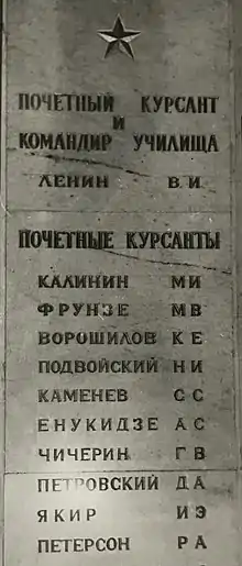 In honor of its 1917 establishment and status as the oldest officer cadet school in Russia, since 1967 it has been the final school and military unit to mark the end of military parades in Moscow's Red Square. During the Moscow Victory Day Parade, members of the school also take part in the historical part.[3] It also maintains privilege, granted in the 1920s, to hold graduation and commissioning parades there. From 1924 to 1935, the Corps of Cadets mounted guards of honour (No.1 Sentry) at Lenin's Mausoleum by orders of the All-Russian Central Executive Committee. In addition to Lenin, individuals honored as honorary cadets by the school were Mikhail Kalinin, Mikhail Frunze, Kliment Voroshilov, Nikolai Podvoisky, Sergey Kamenev, Avel Yenukidze, Georgy Chicherin, David Petrovsky, and Iona Yakir.