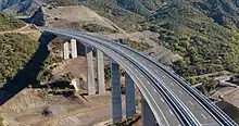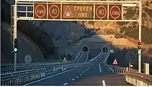 The system has inherited some from the former Yugoslavia, although new sections have been completely built in the recent years. Pay-tolls (Macedonian: patarini) remain in place and the speed limit is 130 km/h (81 mph).[1] The total length of the motorway network as of December 2020 is 317 km,[2] with extra 57 km being under construction. The works on the first couple kilometers of the motorway from Skopje to Kosovo's border started in 2020, while the Gostivar-Kicevo section is expected to start in 2022. Also there are plans to extend the A2 motorway from Trebenista to Kjafasan making a motorway connection to the border with Albania.[3] Furthermore, most stretches of the existing network have been reconstructed, so overall the Macedonian motorways are in decent shape[4]