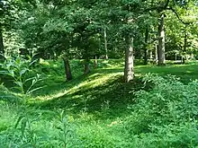 The term earthworks includes any structure made from the earth. In Native American studies, there are three primary types: mounds, circular enclosures, and complexes. All are found in Central Indiana and in the state park.[5] Mounds State Park has a complex of enclosures, both circular and rectangular. There are seven enclosures and four additional earthworks, which have been divided into two groups, the northern complex and the southern complex. The "Great Mound" enclosure is the dominant structure in the park and the southern group.[5]