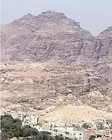 Based on the writing of Josephus,[1] it has customarily been identified with the Jebel Nebi Harun ("Mountain of the Prophet Aaron" in Arabic) or simply Jebel Harun, a twin-peaked mountain 4780 feet above sea-level in the Edomite Mountains on the east side of the Arabah section of the Jordan Rift Valley. On the summit is a mosque from the Mamluk period, traditionally marking the so-called "Tomb of Aaron" and built over the remains of a Byzantine church,[2] and in the saddle west of it are the remains of a Byzantine Monastery of Aaron.
