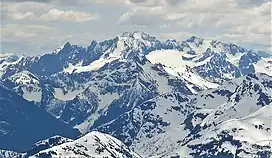 Mount Rahm (8,480+ ft (2,580+ m)) is in North Cascades National Park in the U.S. state of Washington.[2] Located in the northern section of the park, Mount Rahm is less than .25 mi (0.40 km) south of the Canada–United States border, just north of Silver Lake, and 2 mi (3.2 km) north-northeast of Mount Spickard. The peak is estimated to be between 8,485 and 8,525 ft (2,586 and 2,598 m) above sea level, and it sits at the northeastern end of Custer Ridge. Mount Rahm was named after Dr. David Allan Rahm (1931–1976), author and professor, who published and lectured about the geology of the surrounding area.[3]