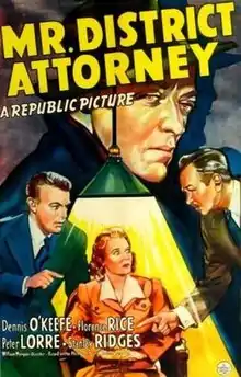 Mr. District Attorney is a 1941 American comedy film directed by William Morgan and written by Karl Brown and Malcolm Stuart Boylan. The film was based on the long running and popular radio series Mr. District Attorney. It stars Dennis O'Keefe, Florence Rice, Peter Lorre, Stanley Ridges, Minor Watson and Charles Arnt. The film was released on March 27, 1941, by Republic Pictures.[1][2][3] It was followed by a sequel Mr. District Attorney in the Carter Case later in the year, with different actors in the leading roles.