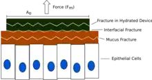 Mucoadhesion describes the attractive forces between a biological material and mucus or mucous membrane.[1] Mucous membranes adhere to epithelial surfaces such as the gastrointestinal tract (GI-tract), the vagina, the lung, the eye, etc. They are generally hydrophilic as they contain many hydrogen macromolecules due to the large amount of water (approximately 95%) within its composition. However, mucin also contains glycoproteins that enable the formation of a gel-like substance.[1] Understanding the hydrophilic bonding and adhesion mechanisms of mucus to biological material is of utmost importance in order to produce the most efficient applications. For example, in drug delivery systems, the mucus layer must be penetrated in order to effectively transport micro- or nanosized drug particles into the body.[2] Bioadhesion is the mechanism by which two biological materials are held together by interfacial forces. The mucoadhesive properties of polymers can be evaluated via rheological synergism studies with freshly isolated mucus, tensile studies and mucosal residence time studies. Results obtained with these in vitro methods show a high correlation with results obtained in humans.[3][4]
