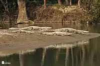 The distribution of the mugger crocodile overlaps with that of the saltwater crocodile in a few coastal areas, but it barely enters brackish water and prefers shallow waterways.[19][65][66][67] It is an apex predator in freshwater ecosystems.[68] It is sympatric with the gharial (Gavialis gangeticus) in the Rapti and Narayani Rivers, in the eastern Mahanadi, and in tributaries of the Ganges and Yamuna rivers.[32][69][37]