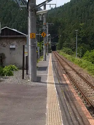 Mukaichiba Station is served by the Iida Line and is 73.3 kilometers from the starting point of the line at Toyohashi Station.