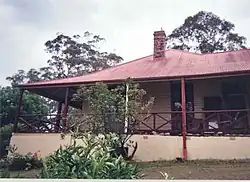 Mulholland's farm house is located on Lot 1 (area of 3 acres 6 roods 1/2 perch) located at the south-west corner of the Smyth's grant. Lot 1 had a water frontage to Brisbane Water, set back by the foreshore reservation of 100', and was bounded by reserved roads on the north (now Elfin Hill Road) and east. While some lots were sold at the time of the auction in 1882, Lot 1 was purchased from Sahl and Nobbs in November 1891 by Charles Thomas Sandon and William Hume for £96/8/11. Sandon later in the same month brought out Hume's interest and at the same time purchased the 100' reservation of land which separated Lot 1 from Brisbane Water. This area had been granted by purchase to Sahl and Nobbs in October 1890 after lobbying the government for rescission of the usual 100' high-water mark reservation. That reservation land became a functional part of the subsequent farm, and the boat shed, wharf, well, road and water pipeline were built on it.[1]
