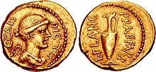 - Lucius Munatius L. f. L. n. Plancus, one of Caesar's most loyal lieutenants, became consul in 42 BC, after the dictator's death. On another occasion he was consul suffectus, but the year is not certain. He befriended Marcus Antonius, then Octavian, proposed the title of Augustus for him in 27 BC, and was Roman censor in 42.[26][27][28][29][30][31][32][33][34][35][36][37][38][39]