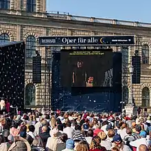 The Munich Opera Festival (German: Münchner Opernfestspiele) takes place yearly in the Bavarian capital from late June to late July.[1][2] Preceding on the calendar the two nearby festivals of Bayreuth and Salzburg, which both start in late July, the festival summarizes the concluding main season's work of the Bavarian State Opera, which administers it, and offers premieres of new stage productions by the company, Germany's largest.