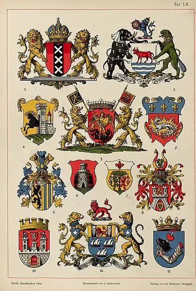 Examples of city arms in Heraldischer Atlas (1899) by Austrian heraldic artist Hugo Gerard Ströhl (note that some of these arms have been altered since):