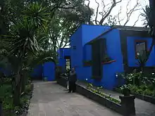 The house/museum is located in Colonia del Carmen area of the Coyoacán borough of Mexico City. Coyoacán, especially the Colonia del Carmen area, has had an intellectual and vanguard reputation since the 1920s, when it was the home of Salvador Novo, Octavio Paz, Mario Moreno and Dolores del Río. Today, the area is home of a number of the borough's museums.[1] The house itself is located on the corner of Londres and Allende Streets, and it stands out for its cobalt-blue walls, giving it the name La Casa Azul (The Blue House).[2][3] Like most of the other structures in the area, the house is built around a central courtyard with garden space, a tradition since colonial times. Originally, the house enclosed only three sides of this courtyard, but later the fourth side was added to enclose it entirely.[2][3] The house covers 800m2 and the central courtyard is another 400m2.[4] As it was built in 1904, it originally had French-style decorative features but later it was changed to the plainer façade seen today.[3][4] The building has two floors with various bedrooms, studio space, a large kitchen and dining room. The entrance hall was decorated by a mosaic in natural stone by Mardonio Magaña of the Escuela de Pintura al Aire Libre in Coyoacán, inspired by the murals done by Juan O’Gorman at the Ciudad Universitaria.[3]