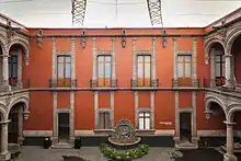 Inside, the house has two floors with two courtyards, which was common with houses of Mexican nobility. The family's coat-of-arms adorn the arches of the main courtyard. One distinctive element of the palace is the fountain in the shape of a shell located in the main courtyard. Its deteriorated condition and the fact that there is little space between it and the windows near it suggest that it dates back to before the 18th-century remodeling. The focus of the fountain is a Nereid playing a guitar. It is possible that the marine motif refers to the sea voyages the Counts made to places like the Philippines.[3]