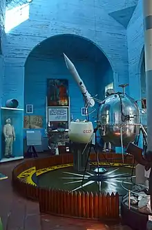 The museum opened in the hall of the relocated church in 1979.[2] It has memorial rooms that recreate the times of Sergei Korolev and Alexander Ishlinsky, as well as an RD-219 rocket engine, a Minsk-32 computer system, a 10 kilograms (22 lb) Foucault pendulum, Devices used on space vehicles, and an SK-II Space suit from Soyuz 23. It also has displays of photos of the moon passing the Earth, as well as from Mars 5, Mars 6 and Venera 9.[4]