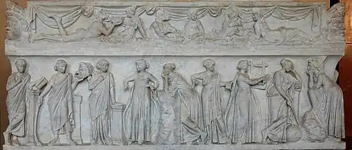 The modern English word 'music' came into use in the 1630s.[8] It is derived from a long line of successive precursors: the Old English 'musike' of the mid-13th century; the Old French musique of the 12th century; and the Latin mūsica.[9][10][n 1] The Latin word itself derives from the Ancient Greek mousiké (technē)—μουσική (τέχνη)—literally meaning "(art) of the Muses".[9][n 2] The Muses were nine deities in Ancient Greek mythology who presided over the arts and sciences.[13][14] They were included in tales by the earliest Western authors, Homer and Hesiod,[15] and eventually came to be associated with music specifically.[14] Over time, Polyhymnia would reside over music more prominently than the other muses.[11] The Latin word musica was also the originator for both the Spanish música and French musique via spelling and linguistic adjustment, though other European terms were probably loanwords, including the Italian musica, German Musik, Dutch muziek, Norwegian musikk, Polish muzyka and Russian muzïka.[14]