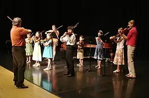 The modern Western world usually defines music as an all-encompassing term used to describe diverse genres, styles, and traditions.[16] This is not the case worldwide, and languages such as modern Indonesian (musik) and Shona (musakazo) have recently adopted words to reflect this universal conception, as they did not have words that fit exactly the Western scope.[14] Before Western contact in East Asia, neither Japan nor China have a single word that encompasses music in a broad sense, but culturally, they often regard music in such a fashion.[17] The closest word to mean music in Chinese, yue, shares a character with le, meaning joy, and originally referred to all the arts before narrowing in meaning.[17] Africa is too diverse to make firm generalizations, but the musicologist J. H. Kwabena Nketia has emphasized African music's often inseparable connection to dance and speech in general.[18] Some African cultures, such as the Songye people of the Democratic Republic of the Congo and the Tiv people of Nigeria, have a strong and broad conception of 'music' but no corresponding word in their native languages.[18] Other words commonly translated as 'music' often have more specific meanings in their respective cultures: the Hindi word for music, sangita, properly refers to art music,[19] while the many Indigenous languages of the Americas have words for music that refer specifically to song but describe instrumental music regardless.[20] Though the Arabic musiqi can refer to all music, it is usually used for instrumental and metric music, while khandan identifies vocal and improvised music.[21]