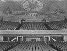 The Music Box's rear promenade is accessed directly from the lobby,[14] which measures 8 feet (2.4 m) wide and 25 feet (7.6 m) long.[28] The lobby was decorated as a simple space, with pink marble baseboards, marble walls, and a plaster cornice. The cornice was decorated with neo-Georgian ornaments. A bronze box-office booth was placed in the lobby.[17] The lobby has a box office because the theater had no dedicated box office when it opened.[29] The floor was made of alternating gray and pink marble tiles.[17] The lobby was separated from the auditorium itself by draped partitions, which removed the drafts that typically occurred behind the last row of seats.[14][17]