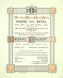 Christchurch Amateur Operatic Society -Theatre Royal, (1886) programme for Madame Favart with music by Jacques Offenbach