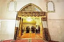 Muslim is revered in Shia Islam for his bravery and moral uprightness, and his story has received much attention from Shia authors.[2] Shias commemorate the events of Karbala throughout the months of Muharram and Safar,[28] particularly during the first ten days of Muharram, culminating on the tenth (Ashura) with processions in major Shia cities.[29][30] The main component of these ritual ceremonies (maj'alis, SG majlis) is the narration of the stories of Karbala,[31][29] intended to raise sympathy and move the audience to tears.[32] It is in these ceremonies that Muslim is commemorated as the "first of the martyrs of Karbala,"[2][1] alongside his sons.[1] A common commemorative narrative describes the emotional scene when Husayn disclosed the death of Muslim to his young daughter, whose family was among those who accompanied Husayn to Karbala.[33] Pilgrimage to his shrine in Kufa is recommended in Shia Islam, accompanied by the recitation of a number of preserved prayers.[1]
