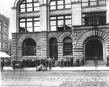 After three years of tumultuous legal battles over Henry Yesler's estate were finally settled, the first order of business was to auction off his many Seattle properties, which began in July 1895. Of these, the Yesler Building garnered the most interest from buyers. Although all sales from the estate were required to be public, it was largely understood that the Mutual Life Insurance Company of New York would be the highest bidder, and they won the building for $130,000.[9] The Mutual Life Insurance Company, which had been established in New York in 1843, opened their Seattle branch in 1890 with Fred L. Stinson as agent. First located in the Safe Deposit Building at the foot of Cherry Street, they moved to the Bailey (now Broderick) Building about a year before purchasing the Yesler Building. Sherwood Gillespy, recently installed as Mutual Life's agent overseeing the entire Northwest region, moved his offices into the building in early January 1896 at which time the building officially became known as the Mutual Life Building.[10] That July they hired prominent local architect William E. Boone, who at that point had mostly set his practice aside to focus on civic affairs, to supervise alterations to the building and completion of the top 3 floors. Their first major change to the building would be replacing the stone relief above the main entrance arch that once said "Yesler Building" with their own name.[lower-roman 3] The redesign, prepared by the prominent New York firm of Clinton and Russell[lower-roman 4][11] would give the building its current projecting copper cornice, not originally envisioned by Fisher or De Neuf; this work would be completed by the end of 1898.[12]