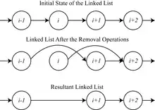 A simple example of why mutual exclusion is important in practice can be visualized using a singly linked list of four items, where the second and third are to be removed. The removal of a node that sits between two other nodes is performed by changing the next pointer of the previous node to point to the next node (in other words, if node i is being removed, then the next pointer of node i – 1 is changed to point to node i + 1, thereby removing from the linked list any reference to node i). When such a linked list is being shared between multiple threads of execution, two threads of execution may attempt to remove two different nodes simultaneously, one thread of execution changing the next pointer of node i – 1 to point to node i + 1, while another thread of execution changes the next pointer of node i to point to node i + 2. Although both removal operations complete successfully, the desired state of the linked list is not achieved: node i + 1 remains in the list, because the next pointer of node i – 1 points to node i + 1.
